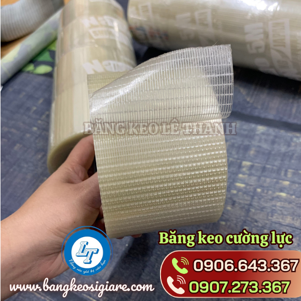 Băng keo cường lực sợi thuỷ tinh hay còn được gọi với cái tên ngắn gọn băng dính sợi thủy tinh, được cấu tạo từ màng polypropylene và gia cố thêm các sợi thuỷ tinh bên dưới lớp màng nên có thể chịu lực và chịu nhiệt cực kỳ tốt.